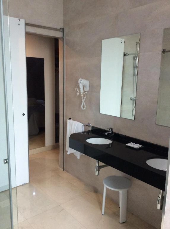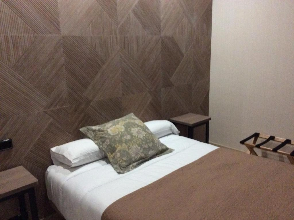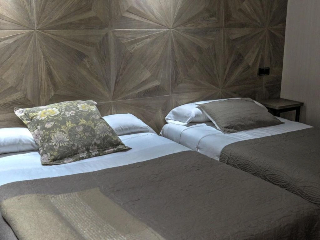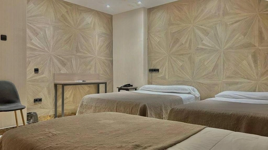 Habitación con dos camas, una silla, escritorio y pared decorativa en tonos beige.