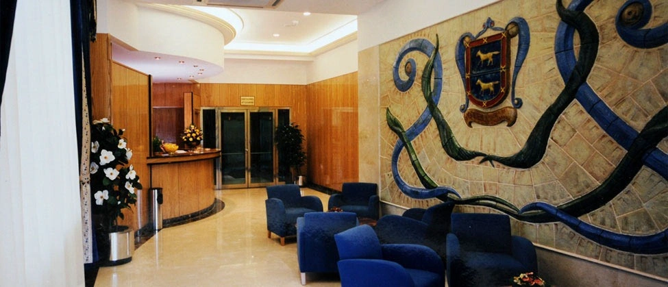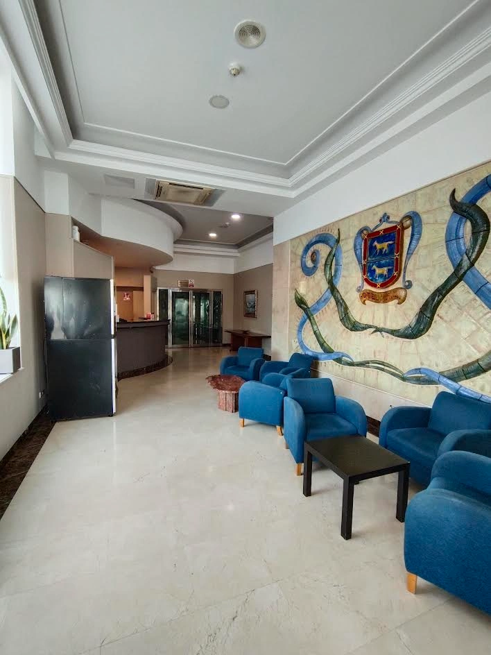 Sala de espera con sillones azules, mesa negra, mural y emblema en la pared.