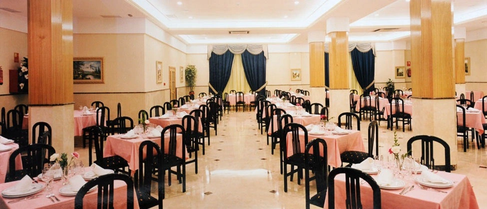 Restaurante elegante con mesas vestidas en rosa y sillas negras, cortinas azules al fondo.